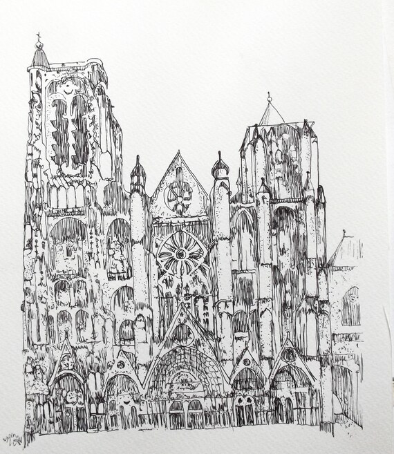 Bourges Catedral Francia Impresion Del Dibujo Original Etsy