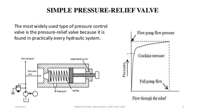 Pressure relief valves are used in hydraulic systems to limit the system pressure to a specific set level If this set level is reached, the pressure relief valve responds and feeds the excess flow from the system back to the tank Note the pressure relief valve is a normally closed pressure control valve Type of Pressure Control Valves. Pressure relief valve A pressure relief valve is a hydraulic component that provides safety to the hydraulic system from excessive pressureThis is normally closed but when the pressure in the hydraulic system increase beyond the set limit of a pressure relief valve, it opens the path and allows hydraulic oil to flow into the tankIn this way, it releases the excessive pressure from the. When your system cannot reach pressure, you’ll likely experience production slowdown, if not total downtime It’s good to know that checking your pressure relief valves can help you determine the problem System is Over Maximum Pressure Pressure relief valves and safety relief valves are what keep your facility safe In the event that your system builds up above the maximum pressure for safe functionality, safety relief valves open up to let off additional pressure, keeping your.