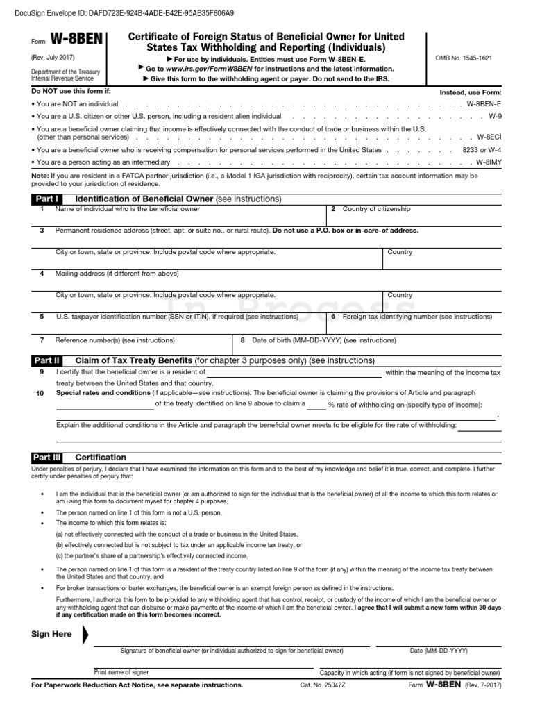 What is a W8BEN?. Form W8BEN, Certificate of Foreign Status of Beneficial Owner for United States Tax Withholding and Reporting, is a form that foreign individuals (nonUS citizens) or business entities need to verify their country of residence for tax purposes. Country of origin US File type PDF Use our library of forms to quickly fill and sign your IRS forms online The Internal Revenue Service (IRS) is a government agency responsible for collecting taxes and administering the federal statutory tax laws of the.