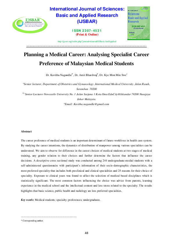 Pdf Planning A Medical Career Analysing Specialist Career Preference Of Malaysian Medical Students Kye Mon Min Swe Academia Edu