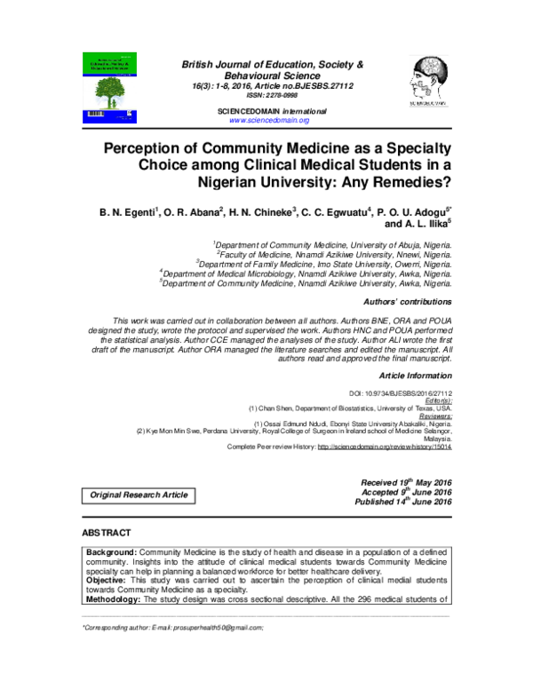 Pdf Perception Of Community Medicine As A Specialty Choice Among Clinical Medical Students In A Nigerian University Any Remedies Prosper O B U N I K E M Adogu Academia Edu