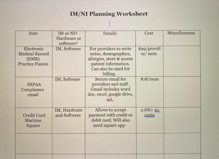Solved Im Ni Planning Worksheet Item Details Cost Miscell Chegg Com