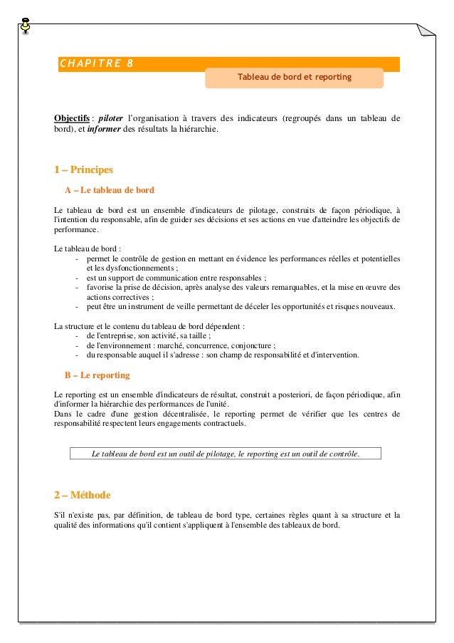 Nouveauté Pilotage Offrezvous un véritable tableau de bord décisionnel, pour suivre la gestion du temps dans votre organisation Votre Tableau de. Tableaux de bord (Germain, 06) Le tableau de bord qui a pour vocation d'aider au pilotage de la performance des entreprises occupe une place spécifique au sein de l'instrumentation du contrôle de gestion notamment parce que la qualité de pallier les déficiences des autres instruments de contrôle lui est souvent attribuée. Management concevoir son tableau de bord, outil de pilotage du service Un document Word de 18 pages Date de publication 22/12/, mis à jour le 23/12/ Consulter l'étude complète X Thumbnails Document Outline Attachments Find Previous Next Highlight all Match case.