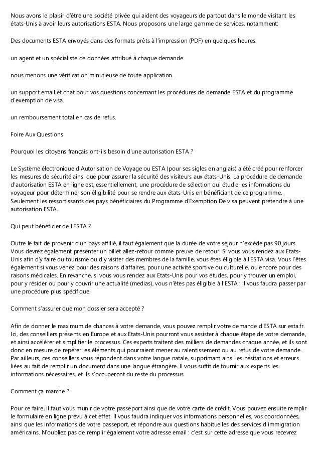 Chez ESTAfr, nous souhaitons que votre voyage aux ÉtatsUnis devienne un bon souvenir et que la préparation de votre voyage soit simple et agréable C'est pourquoi le site vous propose d’effectuer facilement et rapidement certaines formalités. United States Department of State. Simply fill out an ESTA online application, pay the service fee, and you should receive your ESTA VISA within 72 hours, assuming it is approved In order to apply, you will need to have access to your passport details, employment information, contact information including a valid email address, emergency contact and a valid credit card.