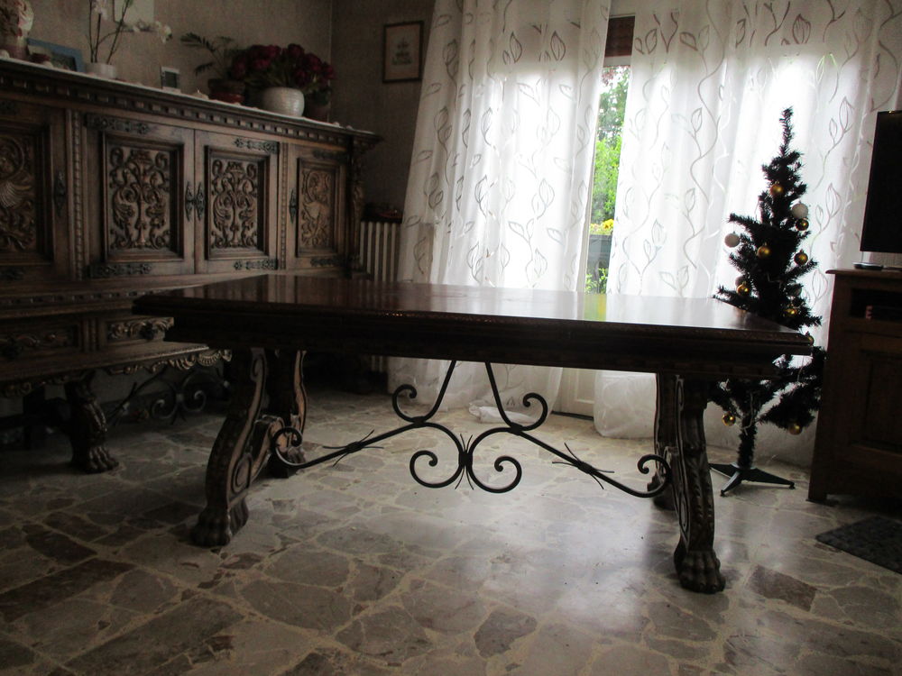 Dimensions 415ʺW × 415ʺD × 325ʺH Styles Renaissance Table Shape Other (unique shapes) Period 1990s Item Type Vintage, Antique or Preowned Materials. During the Renaissance period, the making of furniture in Spain was influenced by the Italian style Initially, the influence was not direct, as it came mostly from across the Pyrénées, from France In the same time, the Spanish possessions in the Low Countries became the source of a great number of Flemish craftsmen working in Spain. Description Superbe salle à manger Renaissance espagnole, entièrement sculptée, volutes en fer forgé aux pieds Composée de Buffet L 2,2 m H 1, m P 56 cm avec 3 portes et 3 tiroirs Table avec rallonges L 1,8 m H 0,76 m Largeur 1 m 6 chaises en cuir bordeaux.