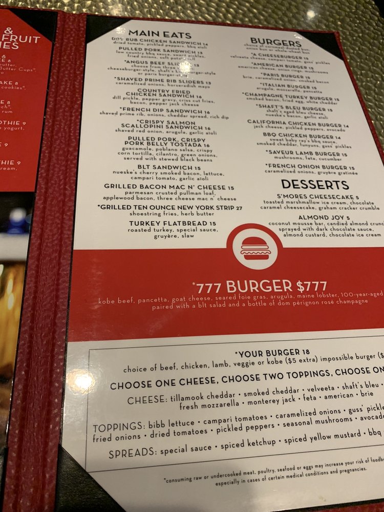 The 777 burger. Marshawn Lynch tastetests a $777 burger from Burger Brasserie at Paris Las Vegas and a $10 burger in Las Vegas, and creates his own custom Beast Mode burg. Jan 09, 21The 777 burger is made with foie gras, lobster meat, and beef Gordon Ramsay's American Road Trip/FOX According to Ramsay, the pub is known for its 777 burger. Jun 05, 13At this point, I'd eaten the equivalent of 35 normal burgers, and yet I was feeling confident, cocky even, like Ken Jennings at a bar trivia night The cheese is all melting happily.