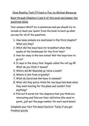 Friend Or Foe By Michael Morpurgo Guided Reading Questions Chapter One
