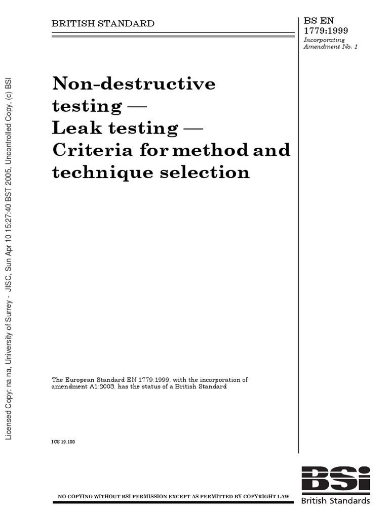En 1779 Non Destructive Testing Leak Testing Criteria For Method And Technique Selection Pdf Leak Gases