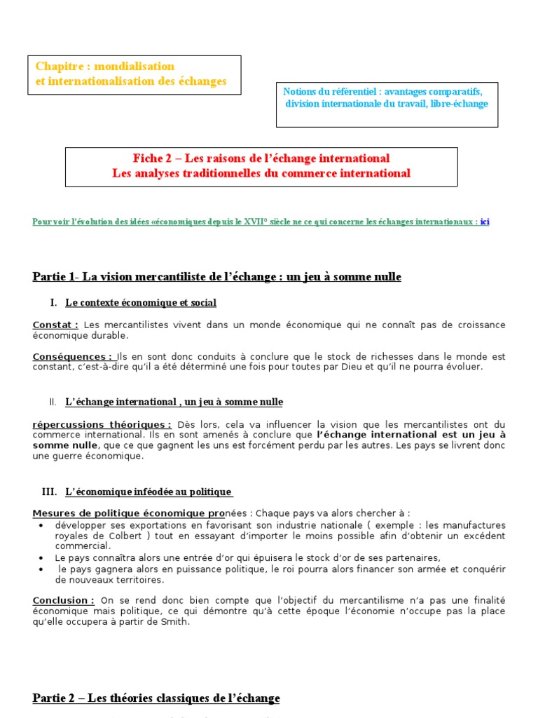 Fiche 2 Du Chapitre Mondialisation Les Analyses Traditionnelles Du Commerce International Avantage Comparatif Mercantilisme