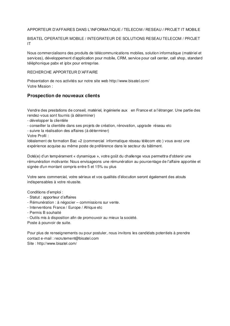 Mentionnée à l’article 21 de la convention collective du 22 mars 17, la prime apporteur d’affaires rend explicite le statut particulier du salarié porté En effet, ce dernier est tenu de décrocher des missions par ses propres moyens comme l’indique l’ Article L du Code du travail. Presque tout le monde peut devenir apporteur d'affaires salarié d'une entreprise à condition de ne pas faire de concurrence à son employeur actuel, commercial, demandeur d'emploi, dirigeant d'entreprise, étudiant, sénior, toutes autres personnes majeures, etc En revanche, ne peuvent pas exercer cette activité, les professions juridiciaires ou. Un agent revient vers vous très rapidement Contacteznous 5 Dès la vente, nous vous reversons une rémunération, directement indexée sur notre commission 4.
