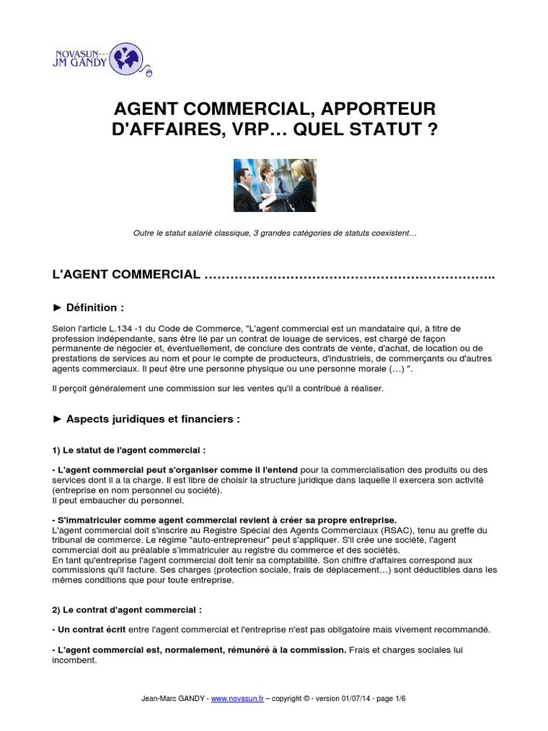 Statut apporteur d affaires. Agent commercial, apporteur d'affaires, VRP quel statut choisir ?. L’activité d’apporteur d’affaires est de nature libérale et est non réglementée aucune loi ne la régit, contrairement au statut d’agent commercial indépendant Il est possible de l’exercer en autoentreprise (microentreprise), entreprise individuelle classique ou encore en société. L'APPORTEUR D'AFFAIRES de par son travail et ses relations est à même d'identifier des besoins clients, commercial et qu'il n'est pas soumis au statut d'agent commercial pour cedit contrat 2 DUREE Le présent contrat prend effet dès sa signature et est conclu pour une durée de 3 mois, tacitement.