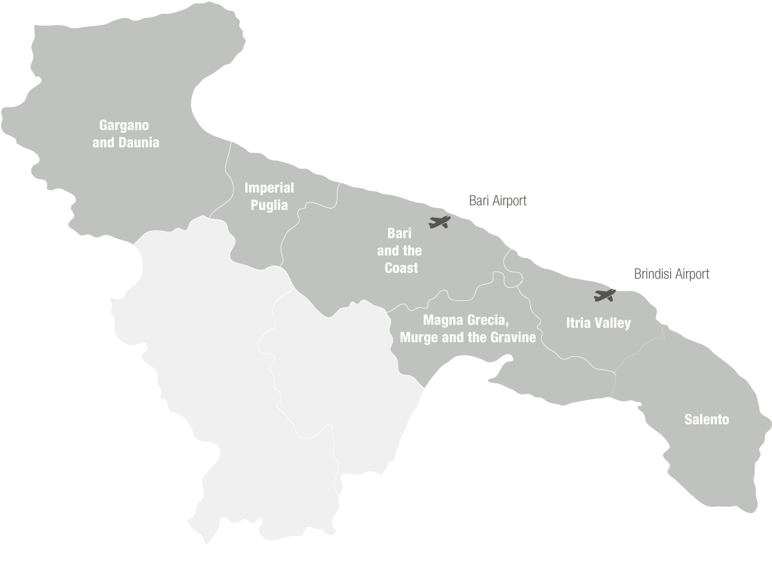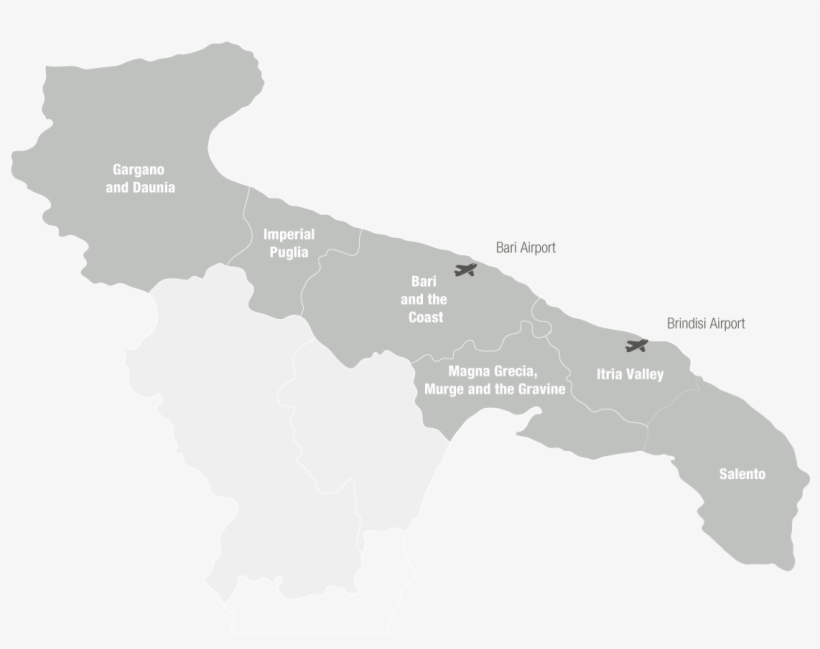 Puglia, also known as Apulia, is a long, narrow region comprising the heel of southern Italy's boot Puglia is a major producer of both wine grapes and table grapes Its name comes from apulvia, or “lack of rain” in Roman. Puglia is an ancient land with a distinct culture within Italy The earliest known settlements date back over 100,000 years The area was settled by the Greeks in the 8 th century BC, followed by the Romans, then conquered in later years by various invaders including the Lombards, Normans, Turks, and Spanish. Puglia is in the southern heel section of Italy When looking at the map of Italy, many consider the shape of Italy to be in the shape of a boot Puglia is famously known to form the heel of this boot, as well as a large section of the calfarea.