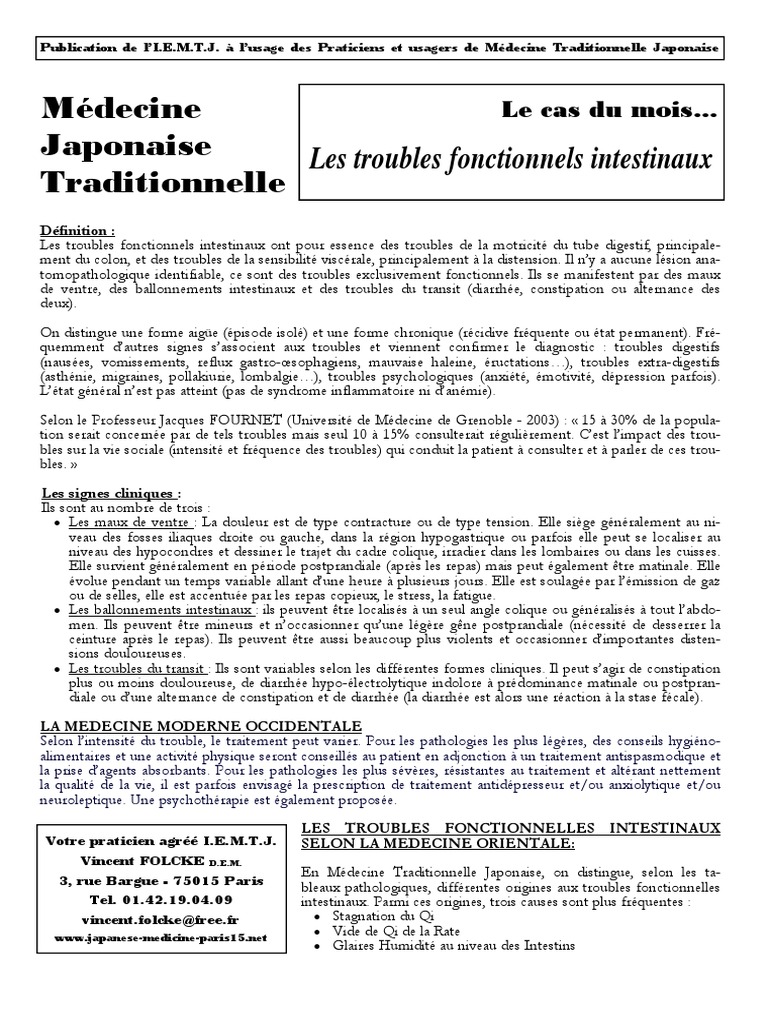 UNE ÉVOLUTION DE STATUT Perçus comme honteux dans un grand nombre de cultures, les troubles fonctionnels intestinaux furent longtemps considérés comme relevant de la vie privée et corrélés au stress et aux émotions davantage qu’à un trouble organique facilement identifiable Le regard a positivement évolué dans les années 1960 grâce aux progrès techniques et scientifiques des. Un ballonnement abdominal peut survenir de façon isolée ou associé à d'autres symptômes gastrointestinaux en cas de troubles fonctionnels (p ex, aérophagie, dyspepsie non ulcéreuse, gastroparésie, syndrome du côlon irritable) ou de lésions organiques (p ex, cancer ovarien, cancer du côlon). Voici la liste des notices gratuites pour troubles fonctionnels intestinaux Nous vous proposons des notices techniques et autres que vous pouvez télécharger gratuitement sur Internet Nous vous proposons des notices gratuites de toutes natures, n'hésitez pas à consulter d'autres fichiers PDF se trouvant dans notre base de données.