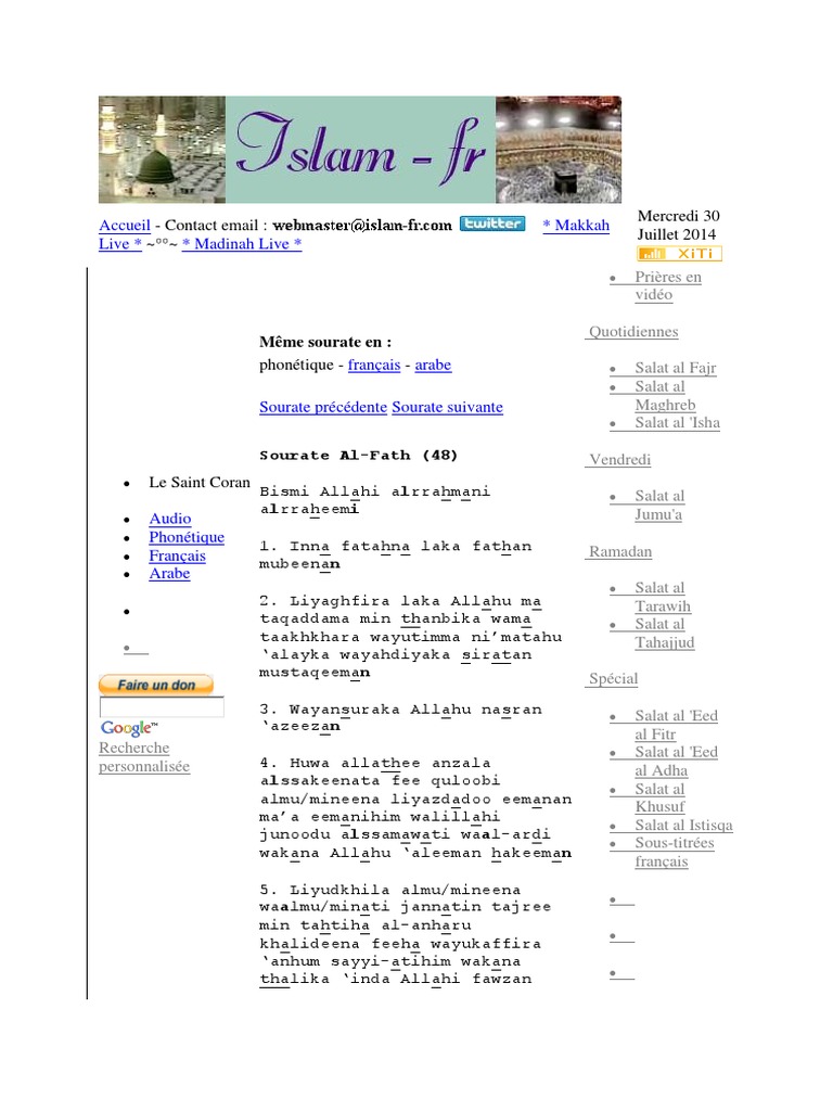 Coran français arabe phonétique Bonjour à tous, Je voudrais savoir si vous connaissiez un site où on peut demander à ce qu'on nous envoie gratuitement un coran en français en arabe et en phonétique svp?. Tu peux , à défaut de la connaitre en arabe , la lire en phonétique ) Qu'Allah t'accompagne dans ton apprentissage Amine Kassoum 04/10/15 1702 Je voudrais savoir si je peux le dire en français le temps d'apprendre en arabe Merci Kassoum 04/10/15 1702. Et prédestinemoi le bien où il se trouve et inspire m’en la satisfaction » L’invocation de la prière de consultation en phonétique & arabe Allâhumma innî astakhîruka bicilmika wa astaqdiruka biqudratika, wa asaluka min fadlikalcazîmi Fainnaka taqdiru wa lâ aqdiru, wa taclamu wa lâ aclamu, wa anta callâmulghuyûbi.