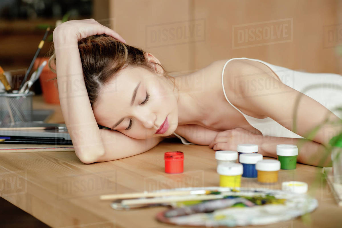 Beautiful Young Woman Sleeping On Table With Paints In Art Studio Stock Photo Dissolve