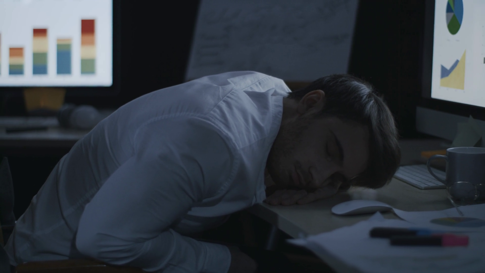 Tired Business Man Sleeping On Desk Front Computer Screen In Night Office Sleeping Business Analyst Lying On Computer Table In Dark Office Stock Video Footage Storyblocks