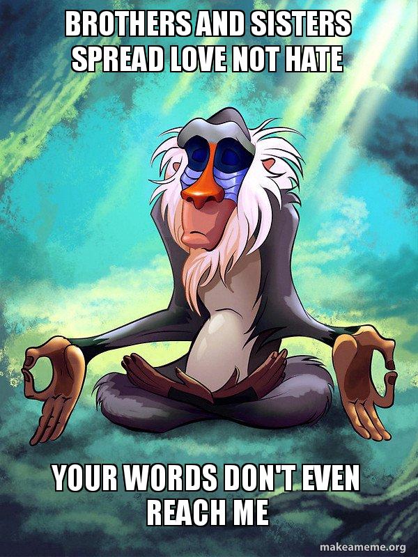 Brothers And Sisters Spread Love Not Hate Your Words Don T Even Reach Me Rafiki Meditating Lion King Make A Meme
