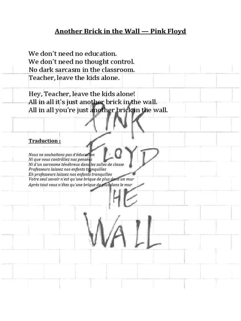 More Free Shipping on Qualified Orders. Découvrez la traduction de la chanson The Wall (entière) par Pink Floyd {Le Mur} Papa s'est envolé. Traduction de Another Brick In The Wall par Pink Floyd {Une autre brique dans le mur} Nous n'avons besoin d'aucune instruction Nous n'avons besoin d'aucun contrôle de la pensée Pas de sombres sarcasmes dans la classe.