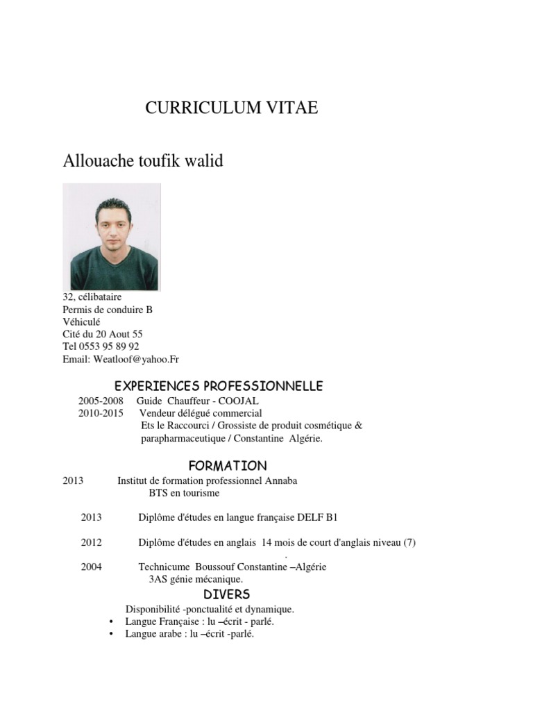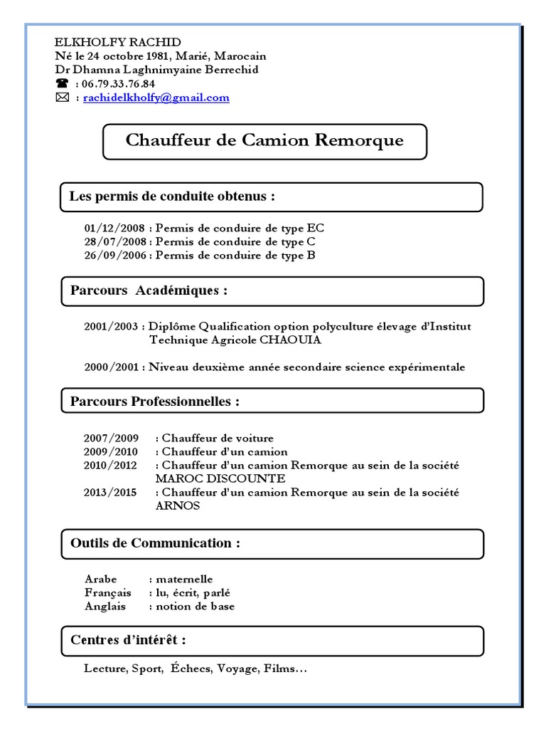 Vérifiez les traductions 'Permis de conduire' en anglais Cherchez des exemples de traductions Permis de conduire dans des phrases, écoutez à la prononciation et apprenez la grammaire. De très nombreux exemples de phrases traduites contenant "avoir son permis de conduire" – Dictionnaire anglaisfrançais et moteur de recherche de traductions anglaises. Type of Resume and sample, exemple de cv avec permis de conduireYou must choose the format of your resume depending on your work and personal background In this section, we will provide a general description of the main types of resumes, which type is most suitable for specific people and their respective samples.