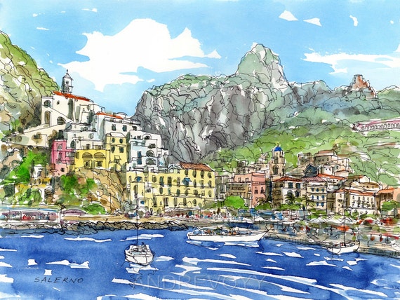 Salerno Italie Art Print Van Een Originele Aquarel Schilderij Etsy