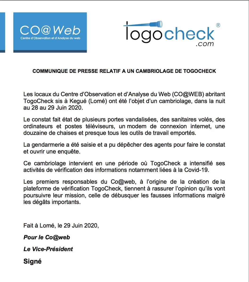 Togocheck Communique De Presse Relatif A Un Cambriolage De Togocheck Les Locaux De Togocheck Sis A Lome Ont Ete L Objet D Un Cambriolage Il Intervient En Une Periode Ou Togocheck A