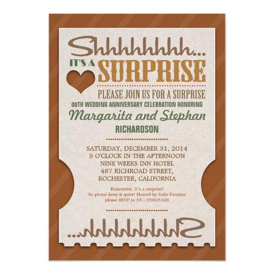 For those hosting the party on the happy couple’s behalf, they don’t have to know either use our one of our surprise anniversary party invitations to start the festivities sub rosa However you choose to commemorate you and your spouse’s years together, our online design tool will help you customize your invitation with the same care you put into your original wedding ceremony. Si vous souhaitez organiser une fête mystérieuse, nous vous suggérons cidessous un exemple de texte d'invitation pour y convier vos amis Retrouver aussi un modèle plus classique pour un anniversaire Vous pouvez aussi vous inspirer de notre exemple pour remercier ses amis après une fête d'enterrement de vie de célibataire. Retrouvez moi sur https//wanncreationproductioncom.