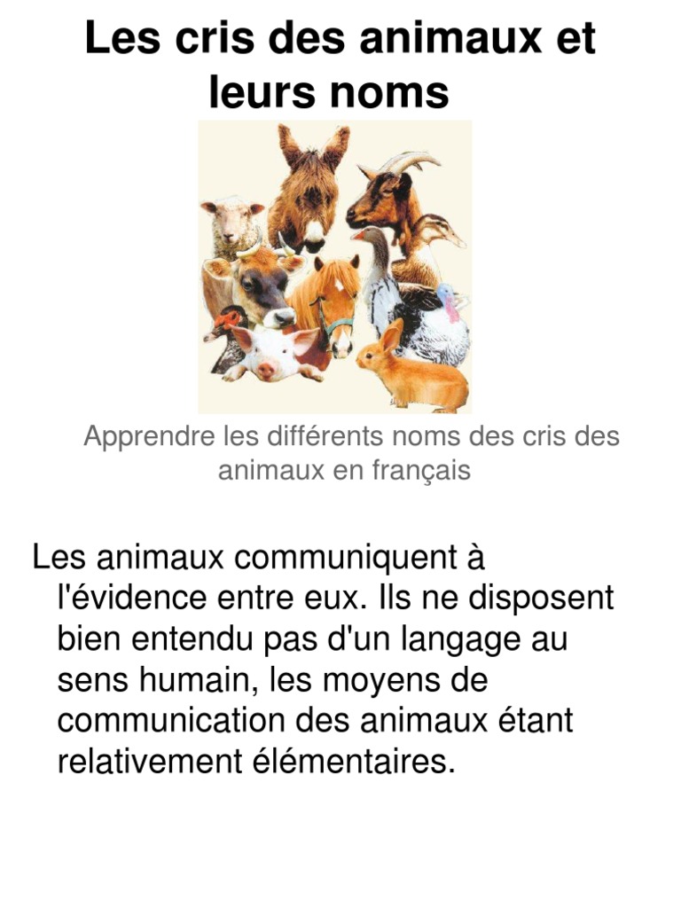 De 100 CRIS D'ANIMAUX DIFFÉRENTS AVEC LA PRONONCIATION DE LEUR NOM EN PLUSIEURS LANGUES Cette application éducative propose des photos d'animaux classées par thème avec les sons émis par les cris de ces animaux et la prononciation de leur nom en différentes langues. VocabulaireCris des animaux cours Le cri des animaux Les noms Les animaux communiquent à l'évidence entre eux Ils ne disposent bien entendu pas d'un langage au sens humain, les moyens de communication des animaux étant relativement élémentaires. Voir cidessous Noms de cris d'animaux et vous n'avez pas à passer les jokers pour passer le niveau et obtenir trois étoiles Ne perdez pas de conseils, car avec notre site, c'est si simple Ajouter une page 94% Noms de cris d'animaux réponse aux marquepages et utilisezle à tout moment 94 pourcent Noms de cris d'animaux réponse.