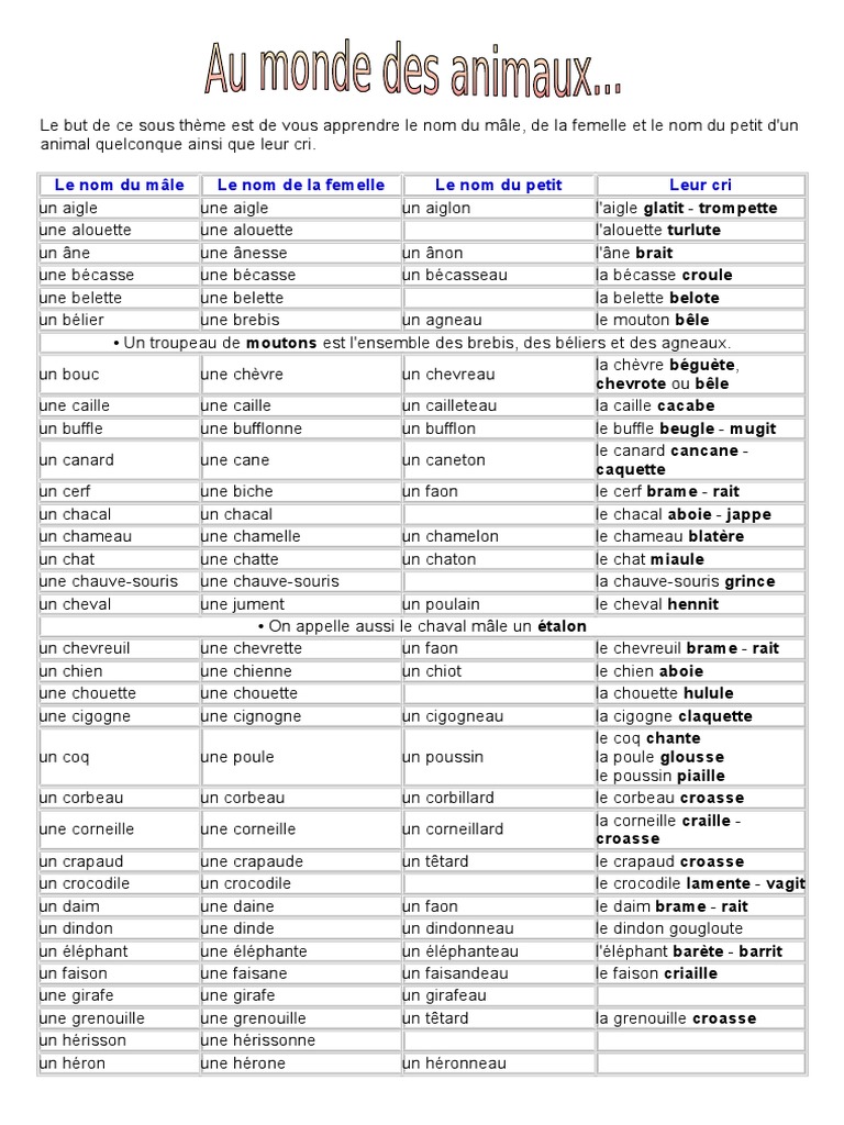 Les Animaux Le Male La Femelle Le Petit Et Leur Cri Learn French Vocabulary Vocabulaire French Francais