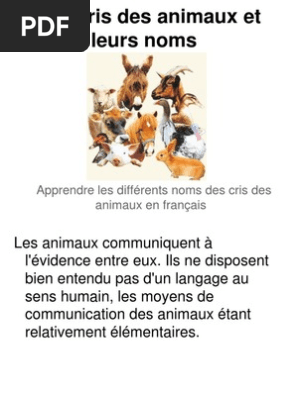 Le cri des animaux Cidessous la liste la plus exhaustive du web francophone sur les cris des animaux Les animaux n'apparaissant pas dans cette liste n'ont pas de nom de cri spécifique. Les cris d'animaux sont très précieux pour restituer la prononciation des langues anciennes baubari, « aboyer » ne peut s'envisager qu'avec au diphtongué Etudier les emplois métaphoriques de ces noms d'animaux et des verbes qui désignent leurs cris ;. Lorsqu’il existe des noms spécifiques pour le mâle et la femelle, le nom de la femelle apparaît entre.