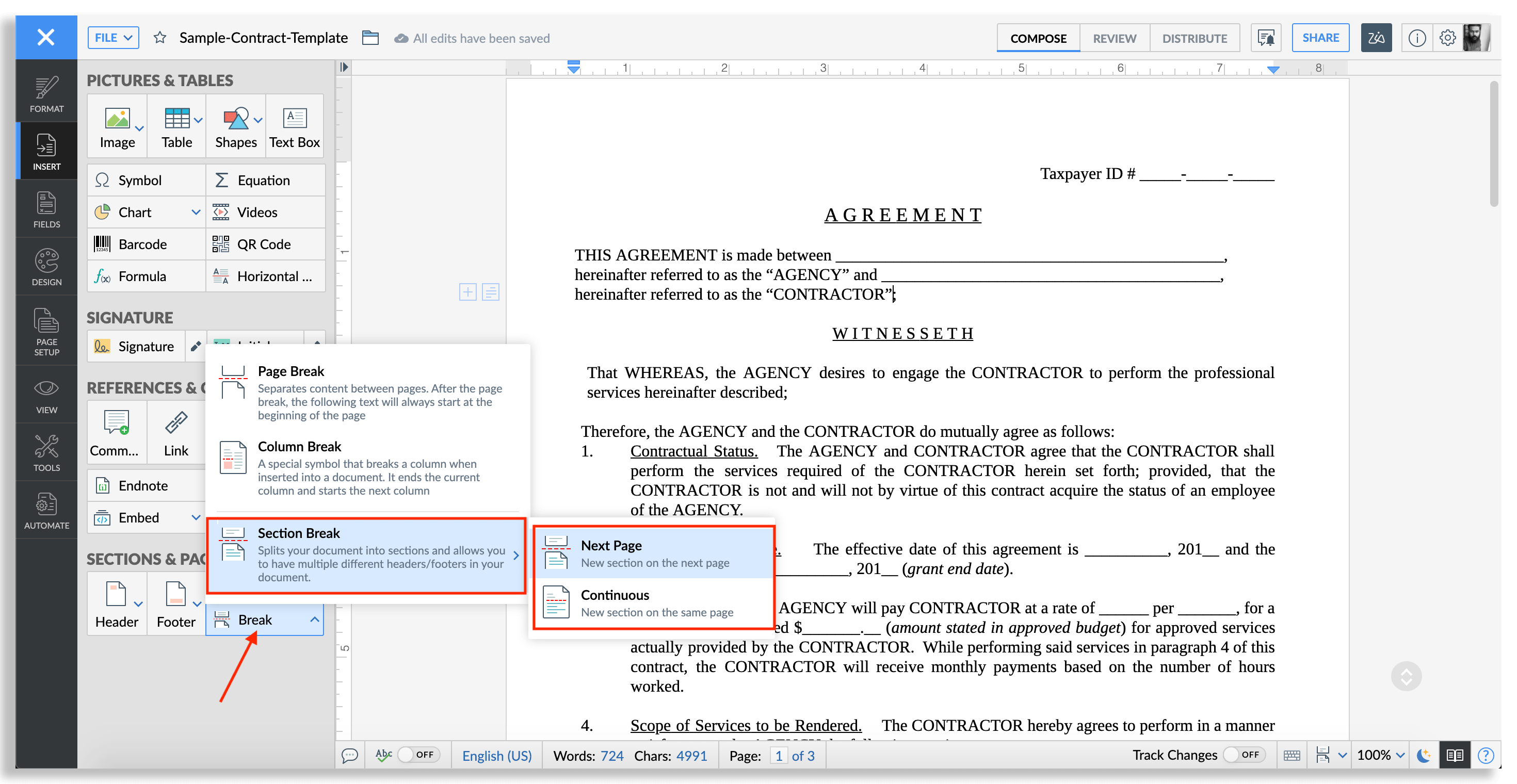 Next page section break. While this DOES indeed insert a section break, there's a problem when it comes to the final document page properties The entire document (before inserting a section break) likely has a specific sectionProperties entry at the end When adding a break the pages before loose those properties Any idea how to make sure the page properties aren't lost?. The Next Page section break starts a new page and starts the new section on the new page This section break is useful when you want to start new chapters in your document Continuous Section Break A Continuous Section Break doesn’t start a new page so you can actually have several breaks on the same page You would use a continuous break if. This will insert the break where your cursor is placed in the document.