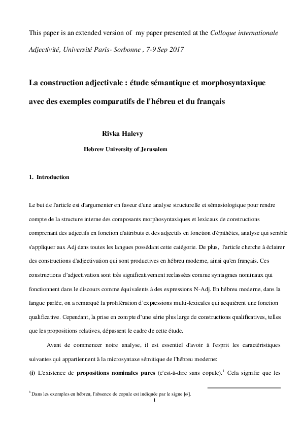 Pdf La Construction Adjectivale Etude Semantique Et Morphosyntaxique Avec Des Exemples Comparatifs De L Hebreu Et Du Francais Rivka Halevy Academia Edu