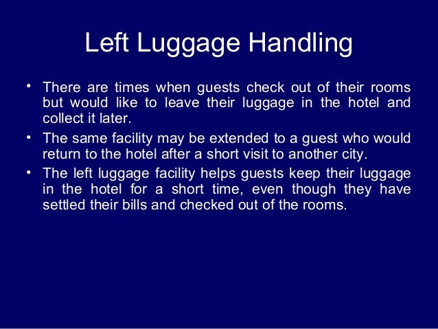 Leftism definition is the principles and views of the left;. The Bell Captain then crosschecks it with the Left Luggage Register The Bell Captain assigns a Bell Boy to bring the luggage from the left luggage room to the bell desk for inspection The Bell Boy tallies the guest counterfoil number with the baggage tag on the baggage and also confirms the description of the baggage mentioned. Hotel Guest Luggage Handling Standard Operating Procedure Template Standard operating procedures are crucial to maintaining consistency and quality of service in a hotel An SOP can form the basis of a checklist for daily tasks and provides training material for new employees and refresher material for existing employees.