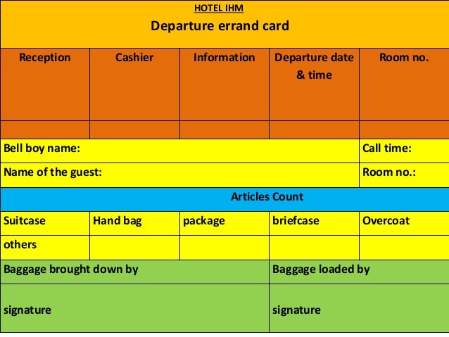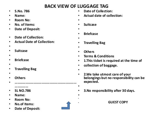 Read this essay on Bell Desk Daily Luggage Movement Register Sample Format Come browse our large digital warehouse of free sample essays Get the knowledge you need in order to pass your classes and more Only at TermPaperWarehousecom". Hotel Guest Luggage tags An added service for your guest Multi numbered with guest tear off Easy to use system for all staff NEED HELP?. All luggage tags should list the owner’s name, email address, and a phone number.