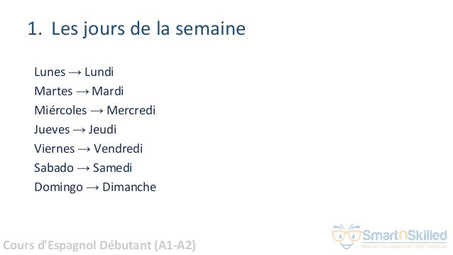 Pas de vocabulaire espagnol avancé ici, on se concentre sur les mots de tous les jours Ce guide en 7 thématiques va vous apprendre à commander au restaurant en espagnol ou encore à gérer une situation d’urgence Prêt à faire chauffer vos neurones ?. Wwwjublie2com/wwwfacebookcom/jublie2LEARN SPANISHLearn the Days of the Week in Spanish with a SongAprende los Días de la Semana en Español con una Cancio. Los días = les jours El día siguiente = le jour suivant La semana = la semaine La semana pasada = la semaine dernière La próxima semana = la semaine prochaine El mes / Los meses = Le mois / Les mois En el futuro = dans le futur Es de día = il faut jour Amanece = le jour se lève La ma ñana = le matin La tarde = l’aprèsmidi.