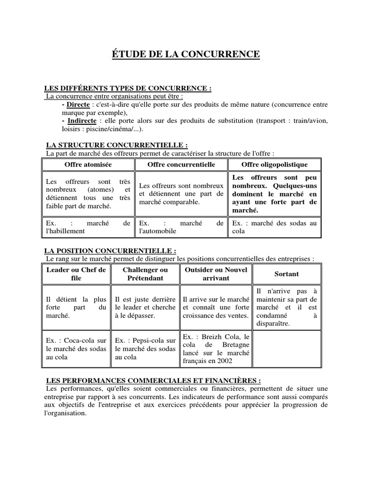 TUDE DE LA CONCURRENCE LES DIFFRENTS TYPES DE CONCURRENCE Lvion, loisirs piscine/cinéma/) LA STRUCTURE CONCURRENTIELLE La part. établir la liste de vos concurrents Il y a les concurrents directs, qui vendent les mêmes offres que vous, les nouveaux entrants, par exemple Dans ce Benchmark concurrentiel, il est nécessaire de se concentrer sur les concurrents auprès desquels vous pouvez apprendre. De votre projet Découvrir et observer les offres et comportements de vos concurrents est une pratique à.