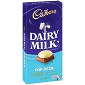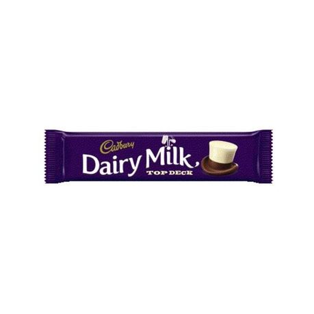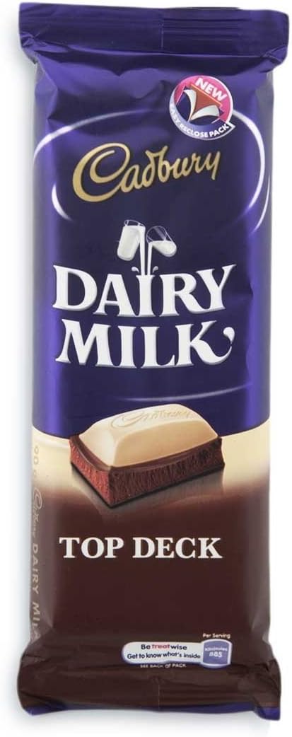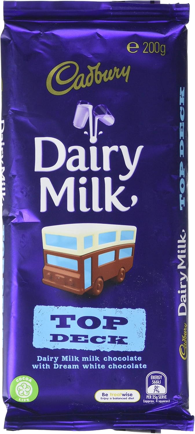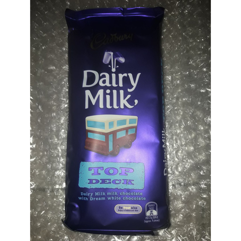 This item Cadbury Dairy Milk Top Deck Chocolate 180g Cadbury Chocolate Bars The big Chunky Selection of Cadbury UK Chocolate 6 FULL SIZE Chocolate bars of delicious Cadbury Chocolate from the UK with unique Gift Box and a free British Chocolate. Cadbury Dairy Milk Top Deck 180g This Australian Top Deck is a tasty combination of Cadbury Dairy Milk chocolate with a layer of creamy white chocolate on the top deck. Bit of both 45 out of 5.