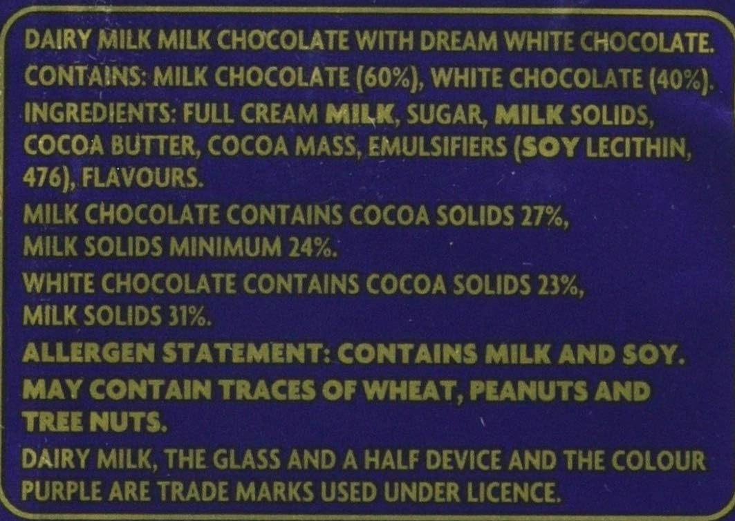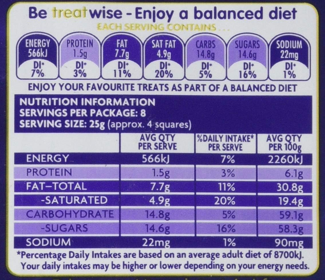 There are 137 calories in 4 squares (25 g) of Cadbury Top Deck Chocolate Get full nutrition facts for other Cadbury products and all your other favorite brands. Place all ingredients (except the rice malt syrup) for the white chocolate in to your blender or food processor Whiz on medium until smooth, scraping the edges as you go Add the rice malt syrup and whiz on low speed for 30 seconds until combined Half fill chocolate moulds with the white chocolate and place in to the freezer. Cadbury Dairy Milk Chocolate with a layer of Dream White Chocolate Cadbury Dairy Milk is perfect for treating yourself and sharing among family and friends Features and Benefits Item No.