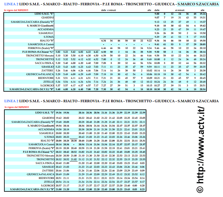 Venice Water Bus Vaporetto Line 2 Water Bus Line N°2 Map Timetables Line 2 Water bus Vaporetto Winter Timetables valid on 5 December Map Station Pier at Piazzale Roma Map Station Pier at Ferrovia Book your Water Bus Tickets Online Water Bus Daily Pass Information » Timetables Line 2 S Zaccaria → P Roma → Rialto/PRoma. The vaporetto network map for Venice’s winter season 21 shows all the city’s public ACTV waterbus routes and stops, as well as the Alilaguna lines from Marco Polo Airport, and lines to the Lido and other islands You can print or download the pdf map to your phone The map is updated twice a year, so beware of older versions!. Le vaporetto, le bus sur l’eau, représente un moyen de transport caractéristique de Venise avec lequel on peut effectuer des déplacements dans la ville et en direction des îles de la lagune Il est souvent plus rapide de se déplacer à pied, mais on ne peut éviter de faire appel au vaporetto , ne seraitce que pour se reposer les pieds ou pour les déplacements les plus longs.