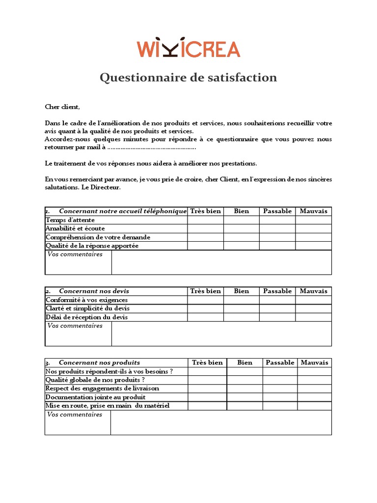 EXEMPLEDEQUESTIONNAIRE& ’ Contexte’cequestionnaireestdestinéàêtreutilisélorsdelavisitedel’entrepriseetce,sicelle 9ci. For a servicebased company, the main agenda stands to be customer satisfaction at the peakHence, customer satisfaction is the most important part of any company to flourish A customer satisfaction survey is used to see how satisfied a customer is with the products and services of your company It acts as a questionnaire that is answered by the customer so that you can easily analyze their. Modèle De Questionnaire De Satisfaction Page 2 sur 50 Environ 500 essais formateur, entreprise cliente) On distingue, par exemple, l'évaluation de satisfaction, l'évaluation du contenu de l'action de formation, l'évaluation des acquis, et l'évaluation des transferts éventuels en situation de travail (Source AFNOR) L.