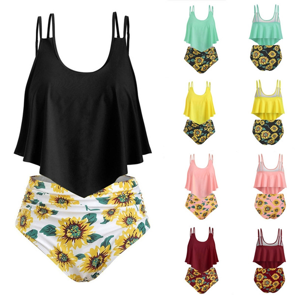 Women Summer High Waisted Bottom Bikini Set Sunflower Print Two Pieces Top Ruffled Bathing Suits Ensemble De Bikini A Taille Haute Pour Femmes D Ete Wish