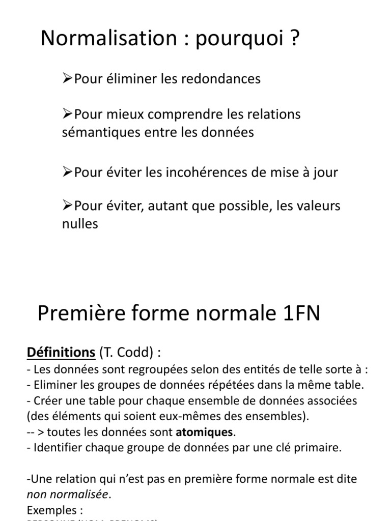 Ajoutez des données Interrogez votre base de données Modifiez le contenu de votre base de données Quiz CRUD en SQL Optimisez votre modèle relationnel avec les formes normales Connectezvous ou inscrivezvous gratuitement pour bénéficier de toutes les fonctionnalités de ce cours !. Wiki Normalisation de base de données Normalisation De Base De Données Conseils La réalisation d'une Base de données Bien Conçuerelationnelconception de la base de la théorie, les règles de normalisation identifier certains les attributs qui doivent être présents ou absent dans une base de données bien conçue. Faciliter la gestion de la structure et des données de la base de.