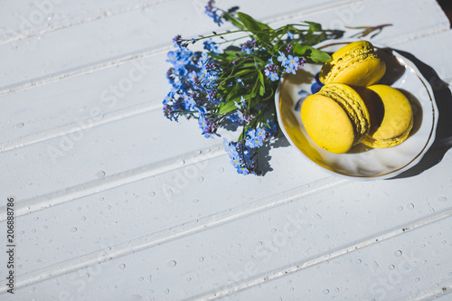 Macaroni Tasty French Dessert On White Wooden Table Macarons On Vintage Background Macaron Is Sweet Toned Image Copy Space Tasty Yellow French Macarons And Forget Me Not Flowers Buy This Stock Photo And Explore