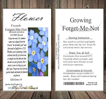 Myosotis Sylvatica (Wood ForgetMeNot) is a shortlived perennial with lovely bright blue, sometimes pink or white, tiny and airy, stellar flowers with charming white or yellow eyes Blooming in dense cymes between mid spring and mid summer, the nectar and pollen is enjoyed by bumble bees and butterflies The flowers rise atop a low mound of semievergreen, oblong, soft, hairy green leaves. A French knight was walking along a river with his lady He bent down to pick her a pretty little blue flower, but his heavy armor caused him to lose his balance and he fell into the current Before sinking forever, he tossed the flower to his lady, shouting “ne m’oubliez pas” (forget me not)!. WwwMySeedsCoFRENCH ~ FORGET ME NOT ~ Myosotis sylvatica Flower Seeds ~ PERENNIAL ZONE 3 9Packet or BULK, We offer EXOTIC as well as EVERYDAY Seeds Our ".