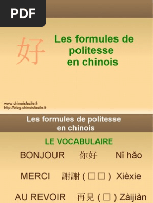 Voici le dialogue du premier cours de chinois Il regroupe les phrases types Il faut donc l'apprendre par coeur Entraînezvous d'abord à le répéter à l'oral, puis à le traduire du chinois au français, puis à transcrire les caractères en pinyin et enfin à le traduire du français au chinois (caractères et pinyin). Voici le dialogue du premier cours de chinois Il regroupe les phrases types Il faut donc l'apprendre par coeur Entraînezvous d'abord à le répéter à l'oral, puis à le traduire du chinois au français, puis à transcrire les caractères en pinyin et enfin à le traduire du français au chinois (caractères et pinyin). En prononçant le mot « merci », c’est comme une source de lumière, de paix et de joie que vous faites jaillir dans votre âme ~ Omraam Mikhaël Aïvanhov La première étape pour se débarrasser d’une mentalité fondée sur la pénurie est de remercier pour tout ce que vous êtes et pour tout ce que vous possédez ~ Wayne Dyer.