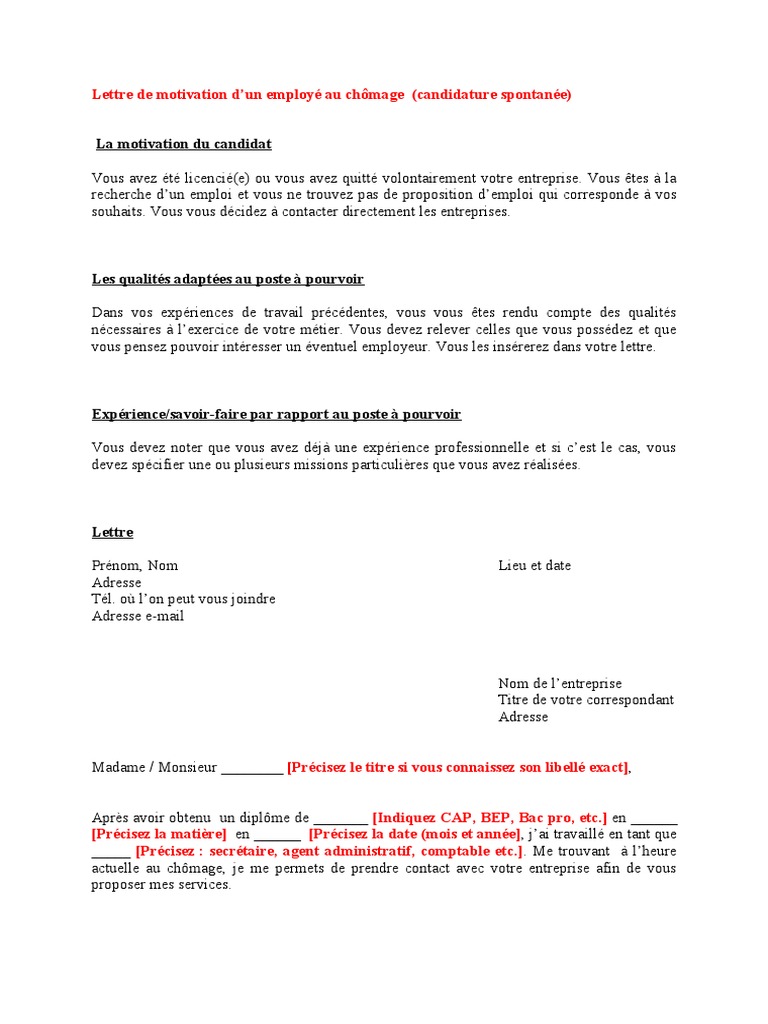 Lettre Motivation Dun Employe Chomage Candidature Spontanee