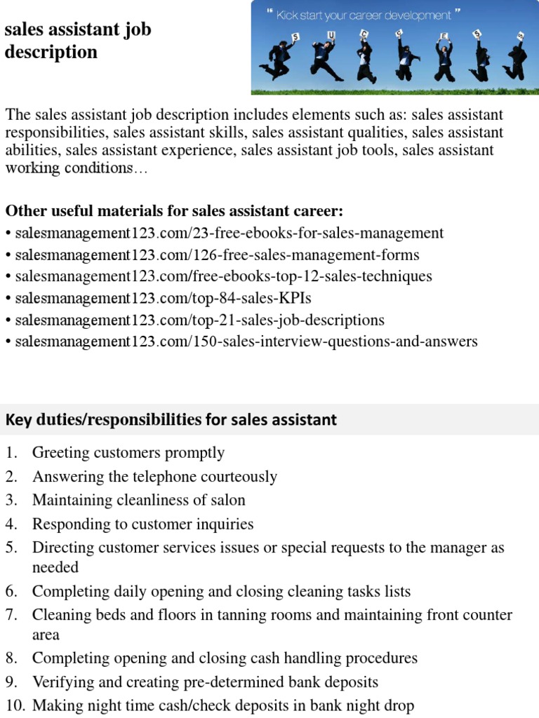 The sales assistant job description is an HR document that outlines the position’s duties and responsibilities, qualifications, and skills This document is commonly used during job posting and regulatory compliance According to Payscale, a software company, a job description is an essential communication tool between the hiring company and. Sales Assistant Job Responsibilities Maintains promotional databases by inputting invoices and billback data Updates managers by consolidating, analyzing, and forwarding daily action summaries Resolves order and inventory problems by investigating data and history;. LiveCareer has Sales assistant CVs in its database LiveCareer’s CV Directory contains real CVs created by subscribers using LiveCareer’s CV Builder Create a job alert for job role title at location.