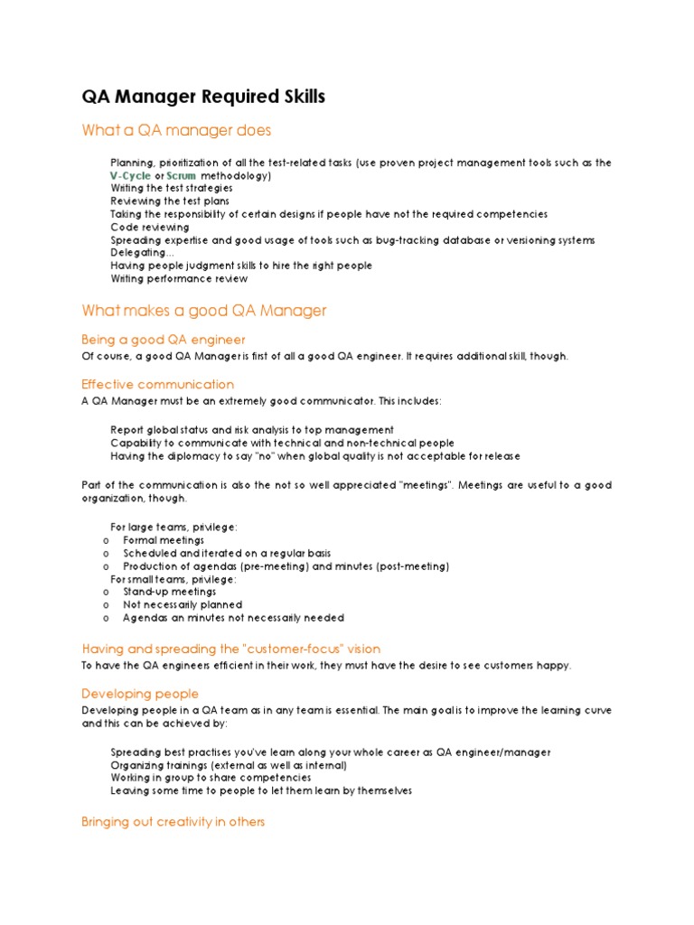 To be a good QA manager, you need strong leadership and teamwork skills to build positive relationships with your QA team Attention to detail and an analytical mind are good qualities to have as a QA manager since your job involves testing products for defects and preparing reports to catalog faulty products Taking initiative in your professional development throughout your career is one way to ensure that you are current with best practices in quality control and able to live up to your. Which ISO 9000 defines as "part of quality management focused on providing confidence that quality requirements will be fulfilled" This defect prevention in quality assurance differs subtly from defect detection and rejection in. Instead of only proving that an application is working fine, a QA manager should guide his team and in fact, work himself to recognize errors that are hidden As a QA manager, you should be able to detect anomalies and guide your team on how to resolve it along with formulating a resolution strategy.