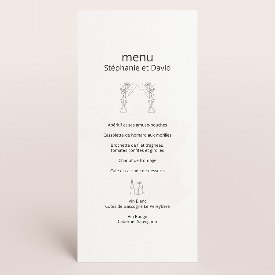 Motifs bucoliques, illustrations campagnardes et dessins floraux sublimeront vos menus. Formulation menu de mariage toasts apéritifs Les toasts Rencontre de l'océan sur canapé Amuses gueules Entrée des saveurs Les péchés mignons de (mettre les prénoms) Rencontre de l'océan sur canapé Canapés de douceur Entrée des saveurs Joyeuse mise en route croustillantes surprises Prélude gourmand sur la route fleurie. Un menu personnalisé pour un accord parfait avec la carterie de votre mariage Pour les cartes de menu de mariage, il est vivement conseillé de l’associer à la décoration de la table et au thème du mariage Puisque c’est un élément que vos proches verront constamment à table, il est important de faire bonne impression et d’avoir.