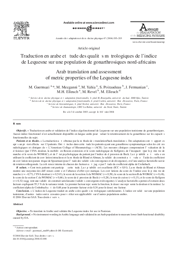 Pdf Traduction En Arabe Et Etude Des Qualites Metrologiques De L Indice De Lequesne Sur Une Population De Gonarthrosiques Nord Africains M Elleuch Academia Edu