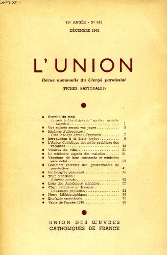 L Union Revue Mensuelle Du Clerge Paroissial Fiches Pastorales 74e Annee N 631 Mars 1947 Sommaire Retraite Du Mois L Esprit Communautaire Schemas D Allocutions Pour Vannee Rakuten